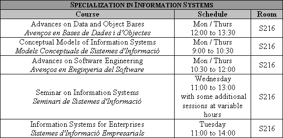 taula assignatures spring semester SPECIALIZATION IN INFORMATION SYSTEMS